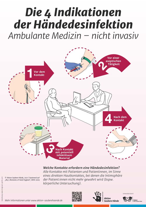 Die Indikationen zur Händedesinfektion, für den ambulanten medizinischen Sektor, wurden von internationalen Experten intensiv diskutiert. Gemeinsam mit der Weltgesundheitsorganisations (WHO), hat die Aktion Saubere Hände, eine Anpassung des Modells für die ambulante Medizin vorgenommen.